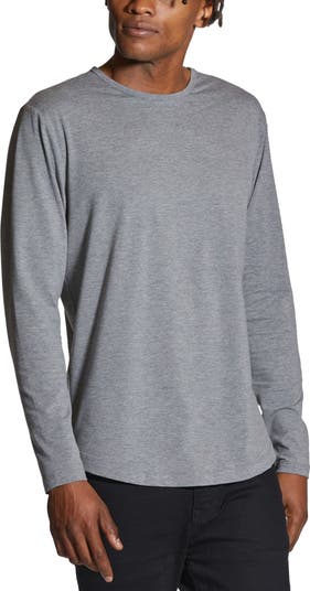 Made from a soft cotton blend, a versatile long-sleeve T-shirt enhanced with a curved hem is an instant closet favorite that looks great alone or layered.