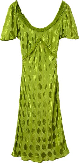 Glossy dots tonally texture a verdant dress cut to a leg-baring length and cut from a feel-good fabric.
