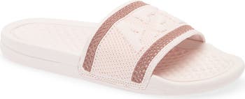 A performance-knit strap sporting an oversized textured logo brings a modern look and a breathable, comfortable fit to a lightweight, cushy sport slide. The nubby, contoured footbed massages your foot with each step, making it perfect for post-workout relaxation.