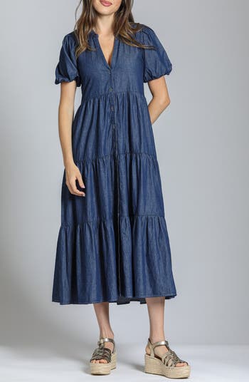 A tiered ruffle skirt brings flouncy movement to this denim maxi updated with puff sleeves for volume and charm.