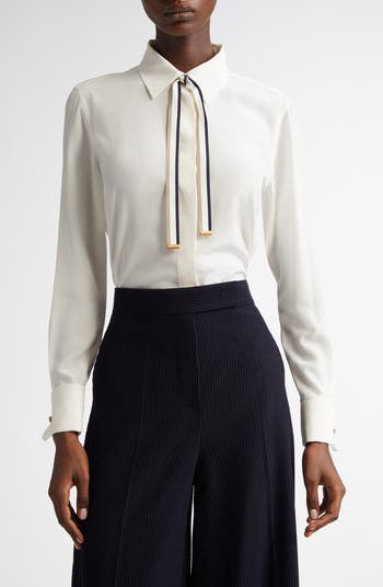 A menswear-inspired style tailored from silk crêpe de Chine, this button-up is the beginning of many a classic look with its knot-button French cuffs and logo-capped grosgrain neck tie.