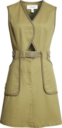 With nods at military style, this cotton-forward dress, offered in a standard-issue shade, streamlines the look with a fitted silhouette and a collarless cut.