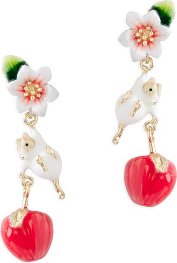 Embrace the playful charm of nature with these captivating drop earrings, from the creator of the Blackberry Mouse, Bill Skinner. Our tiny new adventurer clutches crisp apples hanging from our delicate hand-painted enamel cherry blossoms. Each earring features a delicate apple blossom with a curious little mouse that peeks out adding a touch of whimsical charm to this enchanting design. A juicy red apple dangles playfully below. These earrings aren't just accessories; they're a wearable story, a touch of nature's playful magic, and a conversation starter that's sure to bring a smile. Whether you're drawn to their whimsical charm, captivated by their intricate details, or simply seeking a piece that exudes both sweetness and style, these apple blossom and mouse drop earrings will add a touch of wonder to your collection.