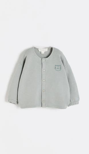 The apple cardigan has long sleeves and snaps down the front. With a classy design and characteristic embroidered animal.
