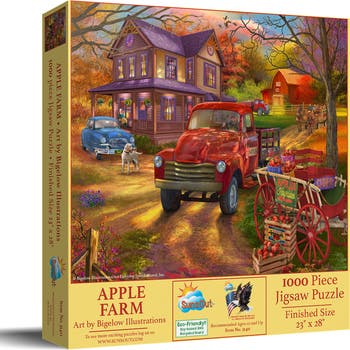 Step into a world of pastoral beauty coupled with American charm with the Apple Farm 1000 Piece Jigsaw Puzzle. This delightful puzzle, with artwork by Bigelow Illustrations, features a quaint American farm scene. Its vivid colors and intricate details promise countless hours of immersive fun, making it the perfect gift for puzzle lovers. SunsOut Puzzles ensure exceptional quality and a great feel; each piece, sized perfectly at 23" x 28", is designed for adults and is crafted from sturdy, recycled cardboard for longevity. The puzzle features pieces that interlock easily, promising a hassle-free and enjoyable puzzle-building experience. SunsOut delights in an eco-friendly approach by using soy-based inks and high-grade recycled board to create puzzles that are not only visually appealing but also support a healthier planet. Proudly made in the USA, each SunsOut puzzle you purchase supports a woman-owned small business, maintaining high manufacturing standards and exceptional customer service. Whether for cozy evenings or group gatherings, the Apple Farm puzzle promises to be more than just an activity; it's a shared experience that evokes the nostalgic elegance of countryside living.