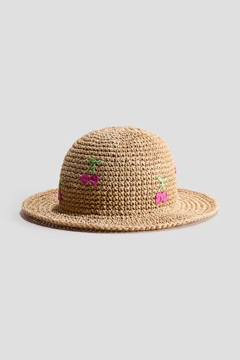 Hat in braided paper straw with all-over appliqués and a woven sweatband. Rounded crown and a flat brim.