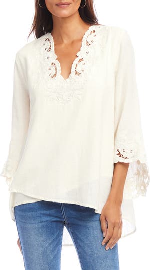 A delicate floral appliqué decorates the neckline and flowy cuffs of this high-low linen-blend top that pairs as well with your favorite denim as it does with more polished styles.