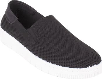 A stretchy topline and elastic gore insets provide a customized feel on a slip-on sneaker featuring a breathable knit upper and chunky platform cupsole.