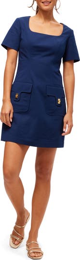Square neck sheath dress with front patch pockets and gold turn lock buttons
