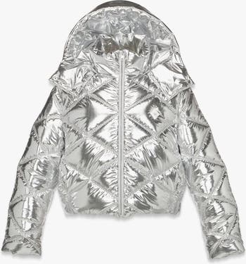 Women's oversized metallic silver polyester padded parka with diamond quilting and detachable hood