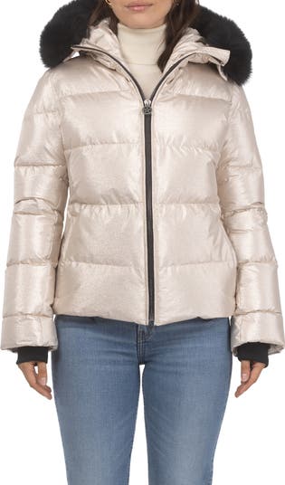 Stay warm and chic with this fitted Après-Ski down jacket, designed to contour your shape while providing superior insulation. The detachable Genuine Shearling hood trim adds a touch of luxury and versatility, letting you adapt your look with ease.