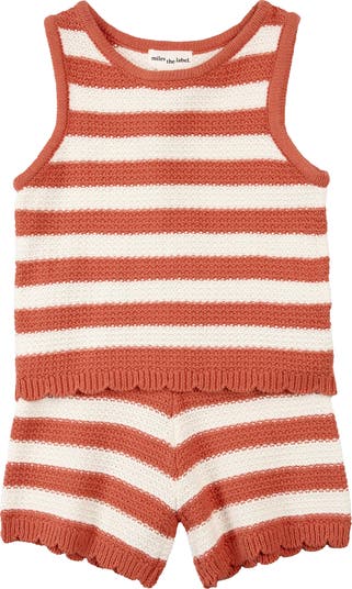 This sweet, striped set for your little one pairs a sweater-tank knit from organic cotton in a crochet-inspired stitch with matching shorts featuring scalloped hems.