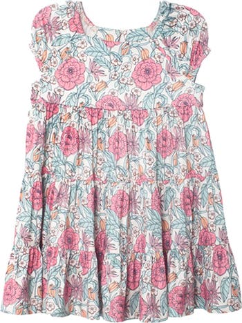 This soft knit cap sleeve dress features a beautiful floral print. Designed with a square neckline, and a tiered skirt, it offers a playful and comfortable fit. Fabric Care & Content Machine Wash Cold | Line Dry | Do Not Bleach 100% Polyester