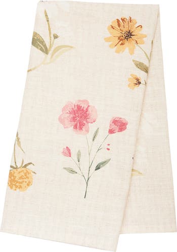 Adorned with a vertical array of alternating daisy flowers in upwards and downwards positions of flowers featuring vibrant yellow petals and subtle green foliage, this printed towel is depicted in a charming watercolor style and presented against a delicate neutral background while embodying the serene warm natural tones and spirit of the early spring seasons.