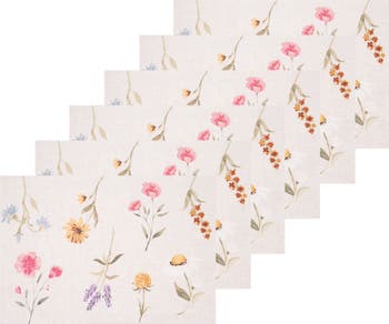 The April Showers printed table linen collection showcases a delightful array of springtime blossoms arranged in a painterly fashion, including lavender, daisies, and various other flowers set against a neutral backdrop. Ideal for gatherings spanning from Easter festivities to the entire spring season with family and friends to rejoice and long for the warmer seasons.