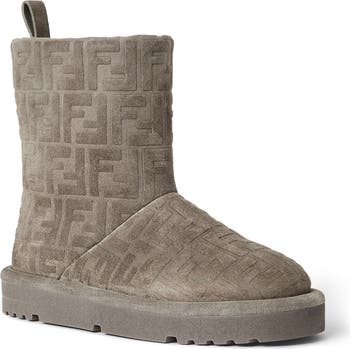 Signature FF logos embossed onto the velvety suede exterior bring Fendi flair to this après ski-style boot lined with plush genuine shearling and grounded by a platform sole.