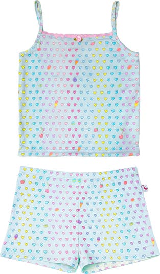 This item is designed to be tight fitting to meet Children's Sleep Safety standards. For a more relaxed fit, we suggest sizing up. Please reference the size chart for more information. Get ready for the coziest nights with this sweet girls' aqua heart-printed cami pajama set! Perfect for tweens, the silky-soft jersey fabric wraps you in a cloud of coziness. The adorable heart print brings instant personality to bedtime, while the shorts' elastic waistband and drawstring tacked at the back gives you the most comfortable fit.
