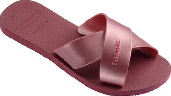 Wide, metallic straps crisscross over the vamp of a weekend-ready slide sandal designed with exceptional flexibility and cushioning for comfortable wear.