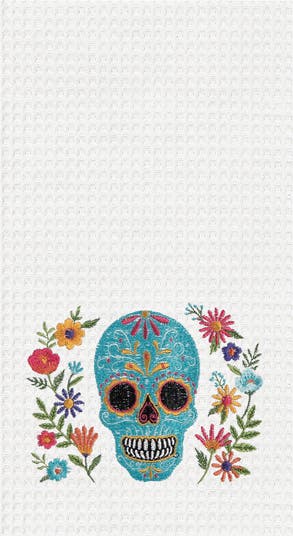 Make your kitchen more vibrant with this Aqua Sugar Skull & Flowers Embroidered Waffle Weave Towel featuring a sugar skull surrounded and decorated with colorful and bright floral designs. Crafted from cotton, this Dia de Los Muertos-inspired towel will bring a splash of color to your home this upcoming seasons.