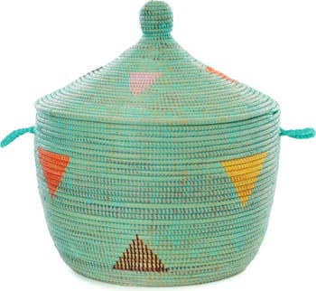 African laundry hampers bring amazing artisan craftsmanship into our living spaces. Our laundry hampers are handwoven by an association of more than 100 rural Wolof women in the West African nation of Senegal. Crafting baskets allows rural women to earn income from the comfort of their community. This basket features playful triangles in red, yellow, black, and lavender on an aqua background. Because this is a handcrafted item, each may vary slightly.