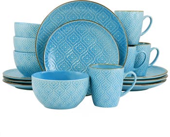 Add a touch of elegance to your dinner table with the Elama Aqualite 16 Piece Embossed Stoneware Dinnerware Set in Teal. Every dish in this collection is crafted from quality stoneware, decorated with embossed designed, trimmed edges and finished in a glossed glaze. Ideal for everyday and special occasion use. This tableware collection comes with a full service for four and is both dishwasher and microwave safe for easy cleaning and and quick reheating.