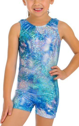 Destira brings you thoughts of warm waters, splendid aquatic life, and shining sea shells with Aquamarine Dream Unitard! A biketard made with dazzling shades of turquoise, blue, and mint in a hologram shatter effect that stands out whether your gymnast is balancing on the beam or tumbling across the floor.