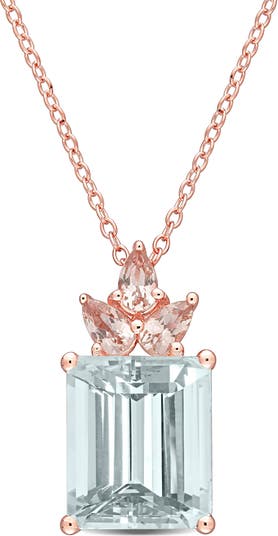 This bold and bright aquamarine and morganite floral crown necklace is crafted in lustrous rose plated sterling silver and features an octagon-cut ice aquamarine at its center with three pear-cut morganite stones in a brilliant floral drop design. Inspired by pastel tones blended with elegance and shine, instantly add a touch of elegance and class to any look with this stunning gemstone necklace.
