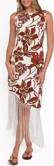 An retro floral print brings summery vibes to a gorgeous sheath dress finished with flowy fringe at the hem.