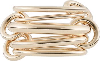 Three slender 18-karat-gold rings are banded together by tiny links to create a single statement-making piece.