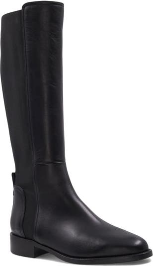 A stretchy back panel offers a comfortable fit on a weatherproof leather boot shaped in a knee-high profile and perfectly balanced with an almond toe and low stacked heel.