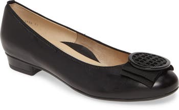 A lattice brooch rests on a flat grosgrain bow that dials up the elegance of this low-heel pump.
