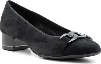 Elevate your office staples with this well-cushioned pump framed by a sleek chain ornament and chunky heel.