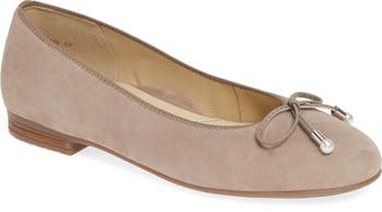 A slim bow tops the toe of an elegant ballet flat grounded by a barely there heel.