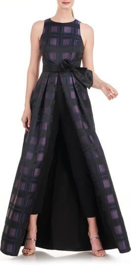 Evening elegance gets a modern update in this chic jumpsuit designed with a satiny bow-tie sash, stretch-crepe pants and an overlay skirt.
