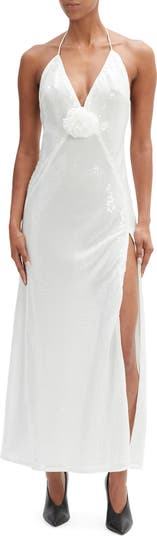 A dimensional rosette highlights the plunging neckline of this event-ready halter gown designed with an airy open back and a leg-baring slit and shimmers in snowy sequins.
