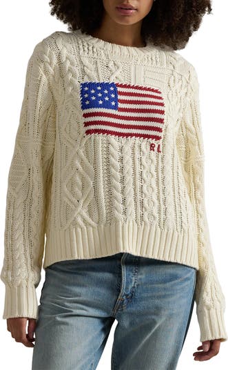 Richly textured Aran knitting adds to the appeal of an all-cotton crewneck that's centered with a blanket-stitched American flag for a folkloric look.
