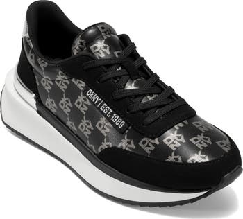Metallic accents and an allover logo pattern make a splash on a lace-up sneaker that's a sophisticated staple style.