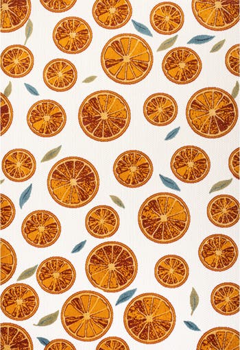 Scattered citrus fruit and leaves add sunny Mediterranean style to your home, updated with modern flair. Our graphic rug will add a bold pop of pattern and color to the living room, dining room, bedroom or office. Perfect for the porch, this pet-friendly and low-pile design is easy to clean.