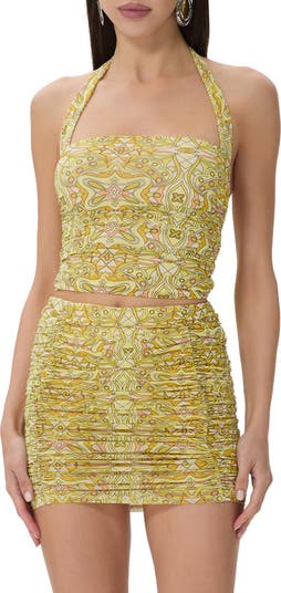 An eye-catching print defines a ruched halter top that adds a fun, fancy vibe to any look.