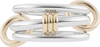 Sterling silver bands are linked together by signature annulets made of 18-karat gold on this sculptural piece that can be stacked or spread across the fingers.
