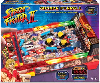 STREET FIGHTER II ARCADE: PINBALL (PREMIUM SERIES) - Bring the excitement of the arcade home with the Street Fighter II Arcade Pinball—an action-packed machine that combines classic pinball gameplay with the legendary world of Street Fighter! Just like a full-size cabinet, the goal is simple: rack up as many points as possible before your ball falls into the drain three times. Featuring iconic Street Fighter II music and sound effects, every round feels like you’ve stepped into a retro arcade showdown. The electronic scoreboard tracks your high scores in real time, while responsive bumpers vibrate upon contact to deliver an authentic pinball feel. Flashing multi-colored LED lights pulse as you strike targets and reach scoring milestones, enhancing every moment of play. With fast-action flippers, dynamic bumpers, and automated ball gutter detection, every turn keeps players engaged as they battle for the top score. Perfect for families, collectors, and gaming fans alike—everyone can take turns to see who claims ultimate victory! Whether placed in a game room, bedroom, or office, this Street Fighter-themed cabinet offers all the fun of a pinball machine at a convenient size and price point, complete with iconic character art and arcade-style flair. FEATURE HIGHLIGHTS: Includes iconic Street Fighter II music & sound effects. Features Ryu, Ken, Chun-Li, and many more. Fast-action flippers for responsive gameplay. Vibrating bumpers & multi-colored flashing LED lights. Automated ball gutter detection. Electronic score counter and arcade audio. Hit bumpers & targets to rack up points. Keep the ball in play & chase new high scores. ADDITIONAL DETAILS: Electronic arcade pinball – original, best-selling size. Includes full EAG pinball mechanics for authentic play. Classic pinball fun at an accessible price point. Perfect for apartments, desktops & small spaces. Packed with beloved Street Fighter visuals and sound.