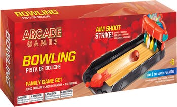 Aim, shoot, strike! Arcade Bowling puts you in the strike zone with a spring loaded shooter and resettable pins. The fast paced game easily assembles in minutes and includes three bowling balls. Move the rotary shooter to get the perfect angle, pull the spring loaded launcher to send the ball forward, and pull the lever down to quickly reset the pins for the next turn. Play by yourself to beat a previous score or compete with the whole family on game night. Recommended for ages 6 years and up. WARNING: CHOKING HAZARD--Small parts. Not intended for children under 3 yrs.