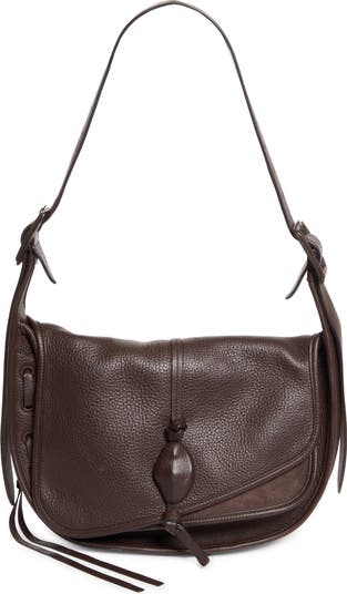This softly structured bag made from pebbled leather is given a rustic look with mixed textures, dangling ties and lacing at the side.