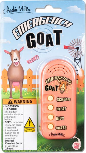 ACCOUTREMENTS: ARCHIE MCPHEE - ELECTRONIC EMERGENCY GOAT NOISEMAKER - It’s a goat emergency! Turns out GOAT not only stands for Greatest Of All Time, but it’s also one of the most delightfully chaotic barnyard animals ever to chew a tin can. We all dream of owning our own herd of bleating, horned kids, but zoning laws, allergies, and confused neighbors often get in the way. That’s where this 3½" Electronic Emergency Goat Noisemaker comes charging in. With four authentic sounds, scream, bleat, kids, and goats, you can summon the spirit of the pasture anytime, anywhere. Staff meeting getting dull? Goat scream. Friend having a bad day? Reassuring bleat. Need to establish farm dominance? Full herd mode. Compact enough for pockets, purses, and emergency overalls, this portable livestock experience delivers instant rural charm without hay in your shoes. Features easy-to-press buttons and includes three LR44 batteries, so you’re ready to hoof it right out of the box. It’s the Greatest Of All Toys. OVERVIEW: Features four authentic goat sounds: scream, bleat, kids, and goats, allat the press of a button. Perfect for pranks, stress relief, or adding instant farmyard flair to any situation. Compact 3½" size makes it easy to carry for on-the-go barnyard emergencies. Simple push-button controls deliver immediate goat chaos anytime you need it.