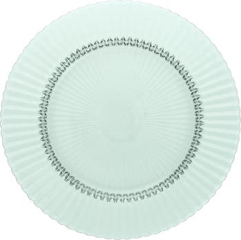 Molded facets inspired by Gothic architecture bring shimmer and distinction to a set of dinner plates crafted from opaque glass to complement any table setting