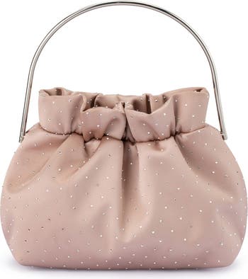 Sparkling rhinestones and a hardware top handle highlight the luxe satin exterior of an evening-ready bag featuring a gathered topline and optional chain strap.