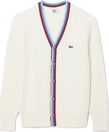 The brand's sportif heritage shows itself through the stripe trim that finishes this archive-inspired cardigan knit with moss stitches and jersey details from fine cotton-and-wool yarns.