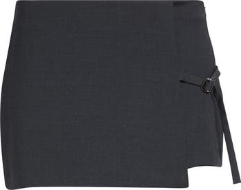 Clean lines and a partial overlay tethered with a buckle strap give this miniskirt understated yet statement-making appeal. The lightweight fabric enhanced with stretch is woven from recycled polyester and wool sourced from sheep raised under mulesing-free practices.