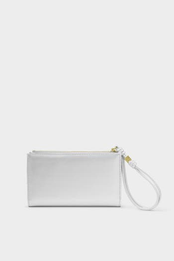 The Arden Large Braided Wristlet Wallet showcases a detachable braided wristlet strap with gold-tone branded hardware for a luxe finish. Designed with a hidden magnetic closure, it opens to reveal six internal card slots and a wide slip pocket for notes and receipts, plus a top zip pocket to keep coins secure.