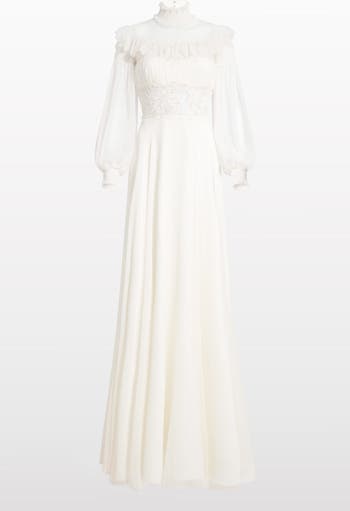 This luxury bridal gown evokes vintage-inspired romance through its high neckline, sheer lace detailing, and billowing chiffon sleeves. The fitted waistline and softly flowing skirt create an effortlessly graceful silhouette. Textured lace panels add depth and structure, balancing delicacy with refinement. A designer wedding dress that captures timeless femininity with poetic, ethereal charm.
